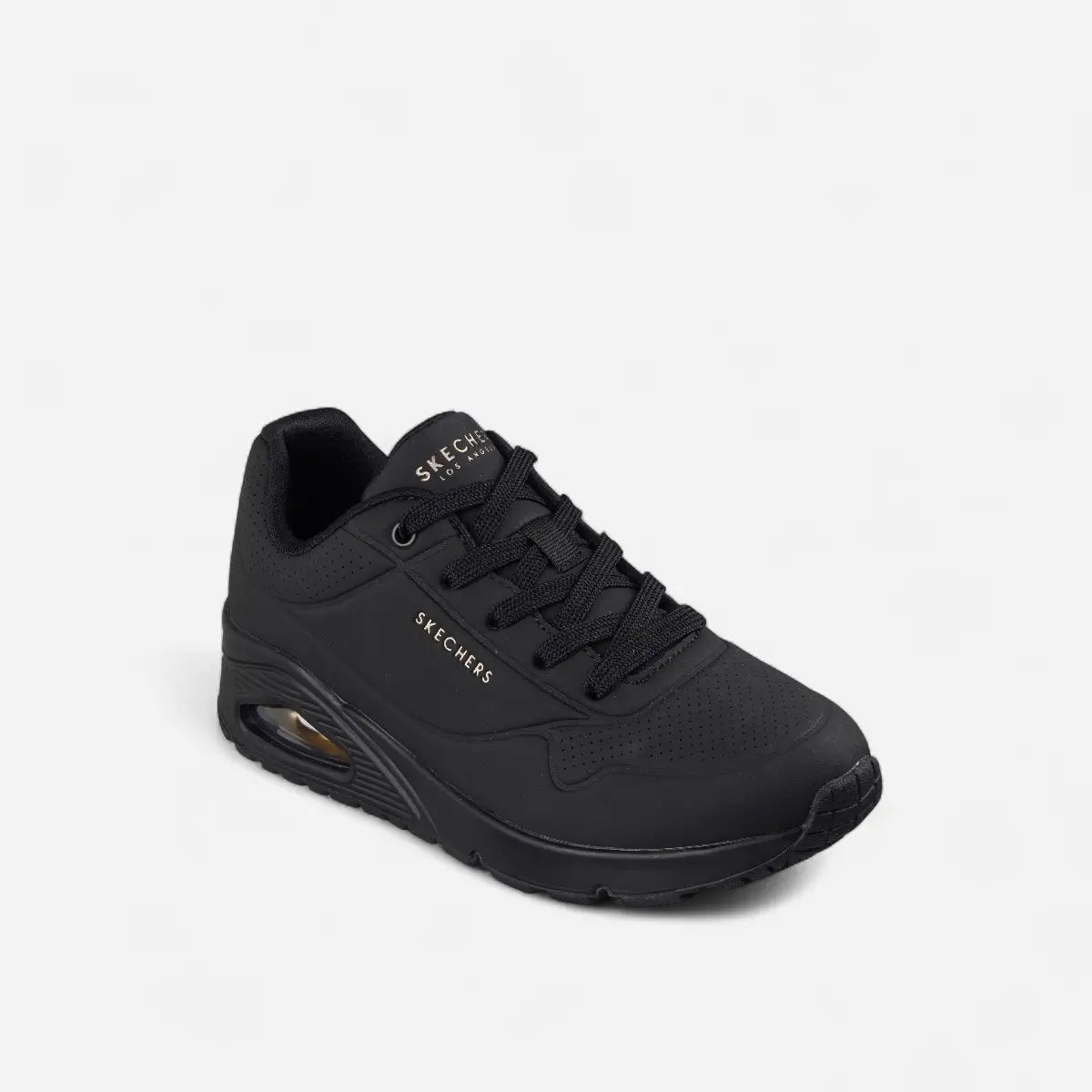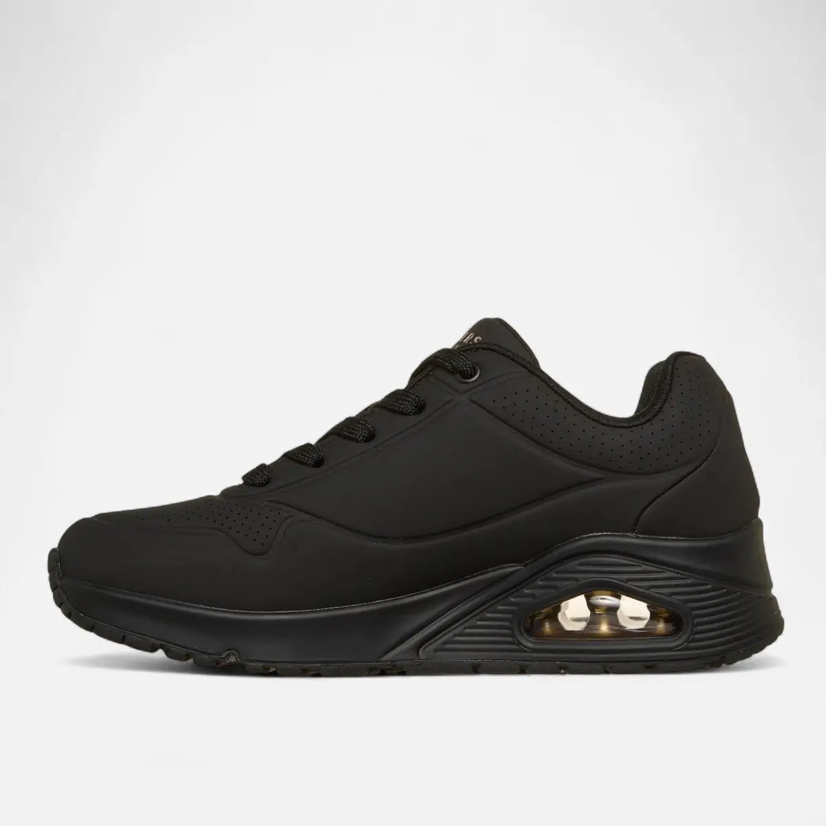 Il classico comfort con ammortizzazione ad aria si unisce a un look total black intramontabile nelle Skechers Street™ Uno – Stand On Air. La tomaia in materiale tecnico liscio traforato dona resistenza e stile, mentre la soletta Air-Cooled Memory Foam™ mantiene freschezza e comfort per tutto il giorno. L’intersuola con tecnologia Skech-Air® visibile offre un’ammortizzazione reattiva, accompagnata da una zeppa nascosta che slancia la silhouette senza rinunciare alla comodità.