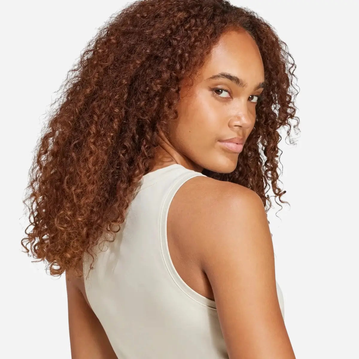 Il taglio olimpionico sul retro dona libertà di movimento e un’estetica femminile, mentre il logo minimal sul petto aggiunge quel tocco sport-luxe che non passa mai di moda. Perfetta da sola o in layering, per l’allenamento, il relax o il daily wear.