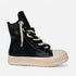 Realizzate artigianalmente in vera pelle Made in Italy, mantengono l’estetica minimal nera della tomaia, arricchita da punta e suola chunky in gomma crema e cuciture a vista che sottolineano la qualità artigianale. La silhouette high-top rimane fedele allo spirito urban DSAS, con l’aggiunta di questo elemento custom che le rende uniche.