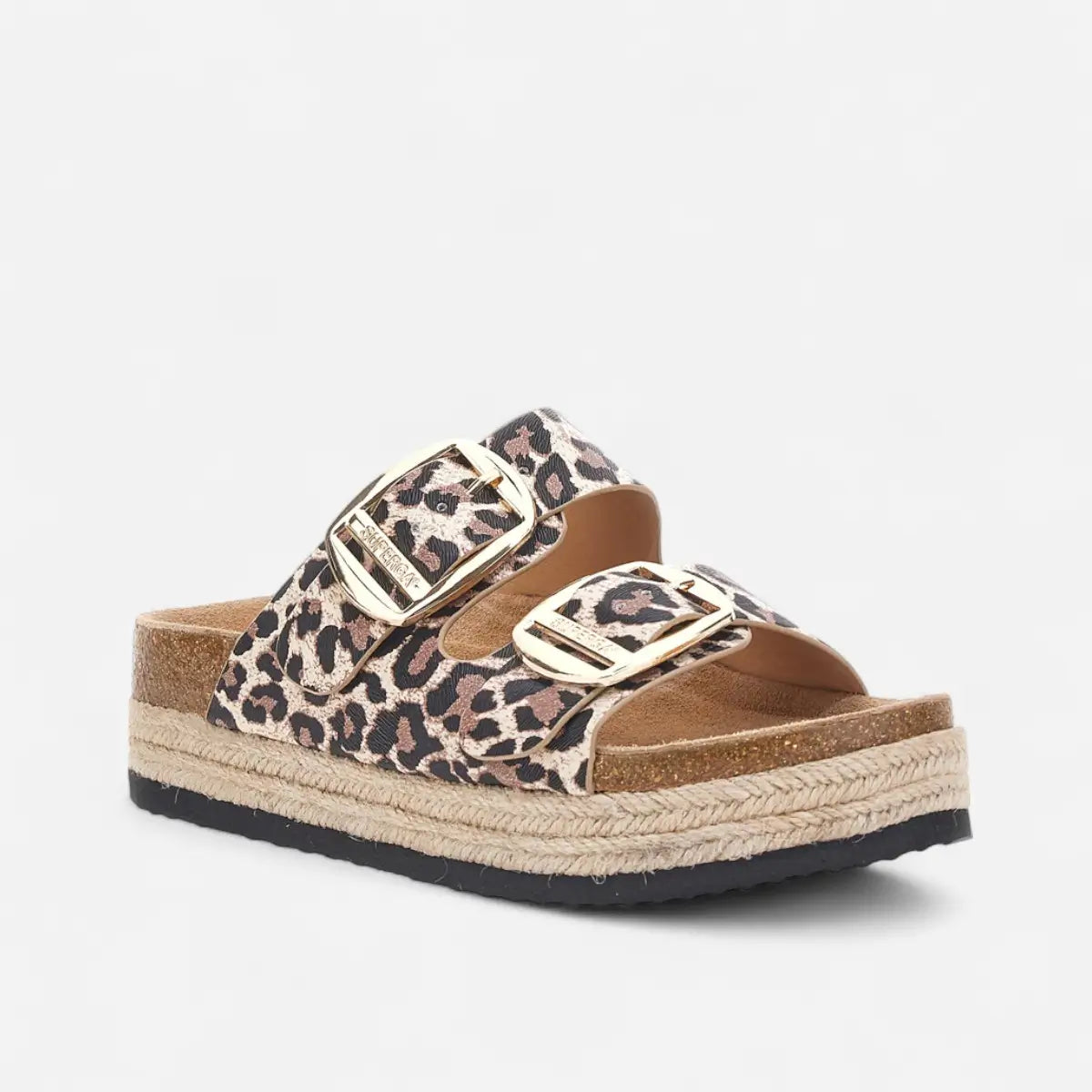 La tomaia in materiale sintetico resistente con stampa leopardata e il plantare in sughero accolgono il piede con comfort quotidiano, rendendo queste ciabatte perfette per accompagnarti dalle giornate in città fino agli aperitivi sul mare.